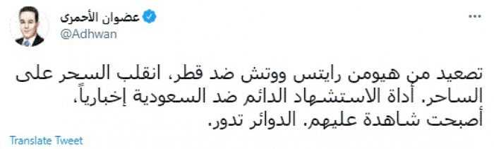 وقال في تغريدة عبر "تويتر" رصدها "المشهد العربي": "تصعيد من هيومن رايتس ووتش ضد قطر، انقلب السحر على الساحر. أداة الاستشهاد الدائم ضد السعودية إخبارياً، أصبحت شاهدة عليهم. الدوائر تدور".