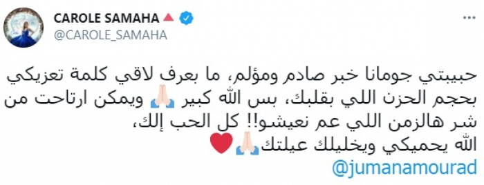 وكتبت كارول، عبر حسابها على تويتر: "حبيبتي جومانا خبر صادم ومؤلم، ما بعرف ألاقي كلمة تعزيكي بحجم الحزن اللي بقلبك، بس الله كبير.. ويمكن إرتاحت من شر هذا الزمن اللي عم نعيشه.. كل الحب لك.. الله يحميكي ويخليلك عيلتك".