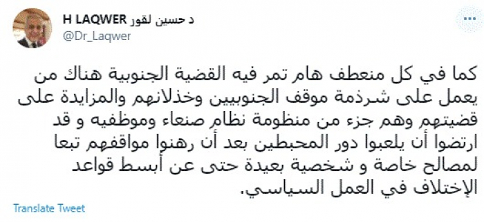 وكتب في تغريدة عبر "تويتر" رصدها "المشهد العربي": "كما في كل منعطف هام تمر فيه القضية الجنوبية هناك من يعمل على شرذمة موقف الجنوبيين وخذلانهم والمزايدة على قضيتهم وهم جزء من منظومة نظام صنعاء وموظفيه وقد ارتضوا أن يلعبوا دور المحبطين بعد أن رهنوا مواقفهم تبعًا لمصالح خاصة وشخصية بعيدة حتى عن أبسط قواعد الاختلاف في العمل السياسي".