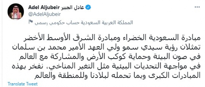 وقال في تغريدة عبر "تويتر" رصدها "المشهد العربي": "مبادرة السعودية الخضراء ومبادرة الشرق الأوسط الأخضر تمثلان رؤية سيدي سمو ولي العهد الأمير محمد بن سلمان في صون البيئة وحماية كوكب الأرض والمشاركة مع العالم في مواجهة التحديات البيئية مثل التغير المناخي، نفخر بهذه المبادرات الكبرى وبما تحمله لبلادنا وللمنطقة والعالم".