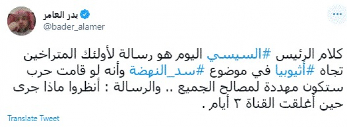 وكتب في تغريدة عبر "تويتر" رصدها "المشهد العربي": "كلام الرئيس السيسي اليوم هو رسالة لأولئك المتراخين تجاه إثيوبيا في موضوع سد النهضة وأنه لو قامت حرب ستكون مهددة لمصالح الجميع.. والرسالة: أنظروا ماذا جرى حين أغلقت القناة ٣ أيام".
