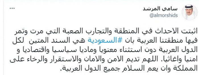 وكتب في تغريدة عبر "تويتر" رصدها "المشهد العربي": "أثبتت الأحداث في المنطقة والتجارب الصعبة التي مرت وتمر فيها منطقتنا العربية بأن السعودية هي السند المتين لكل الدول العربية دون استثناء معنويا وماديا سياسيا واقتصاديا و امنيا واغاثيا. اللهم تديم الأمن والأمان والاستقرار والرخاء على المملكة وأن يعم السلام جميع الدول العربية".