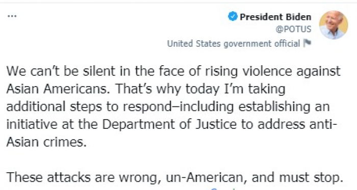 وقال في تغريدة على حسابه بموقع التدوين المصغر تويتر، اليوم إنه: "لا يمكننا أن نصمت في مواجهة العنف المتصاعد ضد الأمريكيين الآسيويين".