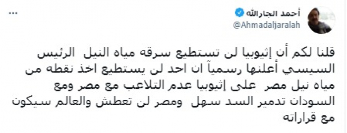 وأوضح في تغريدة على حسابه بموقع التدوين المصغر تويتر، اليوم أننا: "قلنا لكم أن إثيوبيا لن تستطيع سرقة مياه النيل".