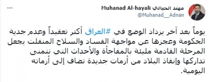 وحذر من أن: "عدم جدية الحكومة وعجزها عن مواجهة الفساد والسلاح المنفلت يجعل المرحلة القادمة مليئة بالمفاجأة والأحداث التي نتمنى تداركها وإنقاذ البلاد من أزمات جديدة تضاف إلى أزماته اليومية".