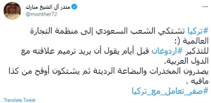 وقال في تغريدة عبر "تويتر" رصدها "المشهد العربي": "تركيا تشتكي الشعب السعودي إلى منظمة التجارة العالمية (: للتذكير أردوغان قبل أيام يقول أن يريد ترميم علاقته مع الدول العربية. يصدرون المخدرات والبضاعة الرديئة ثم يشتكون أوقح من كذا ما فيه. صفر تعامل مع تركيا".