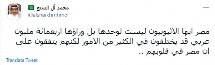 وقال في تغريدة عبر "تويتر" رصدها "المشهد العربي": "مصر أيها الإثيوبيون ليست لوحدها بل وراؤها أربعمائة مليون عربي قد يختلفون في الكثير من الأمور لكنهم يتفقون على أن مصر في قلوبهم".