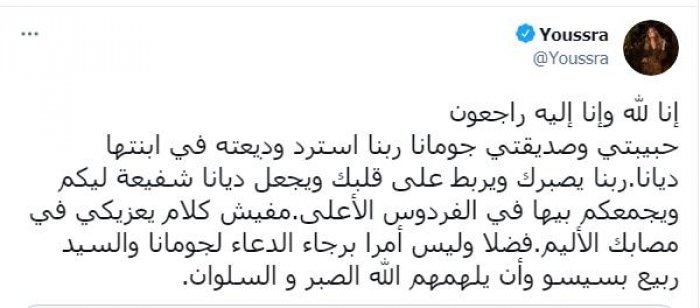 وكتبت يسرا، عبر حسابها على تويتر: "إنا لله وإنا إليه راجعون.. حبيبتي وصديقتي جومانا.. ربنا استرد وديعته فى ابنتها ديانا، ربنا يصبرك ويربط على قلبك ويجعل ديانا شفيعة لكم ويجمعكم بيها فى الفردوس الأعلى، مفيش كلام يعزيكي في مصابك الأليم، فضلا وليس أمرا برجاء الدعاء لجومانا والسيد ربيع بسيسو وأن يلهمهم الله الصبر والسلوان".