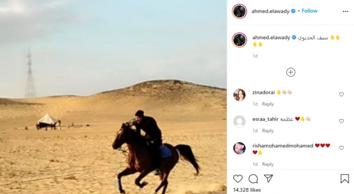 وظهر"العوضي" في الصورة وهو يمتطي الخيل من كواليس العمل، وعلق: "سيف الخديوي".