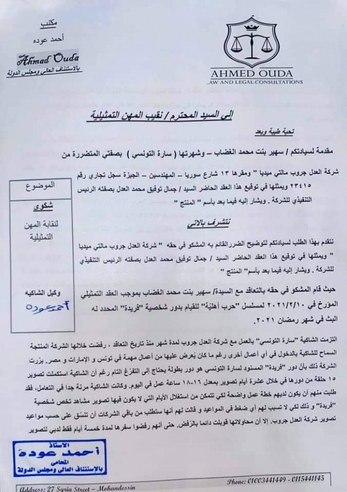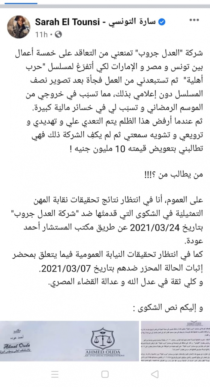 وتابعت سارة: "على العموم، أنا في انتظار نتائج تحقيقات نقابة المهن التمثيليّة في الشكوى التي قدمتُها ضد "شركة العدل جروب" بتاريخ 2021/03/24 عن طريق مكتب المستشار أحمد عودة، كما في انتظار تحقيقات النيابة العمومية فيما يتعلق بمحضر إثبات الحالة المحرّر ضدهم بتاريخ 2021/03/07. وكلي ثقة في عدل الله وعدالة القضاء المصري"