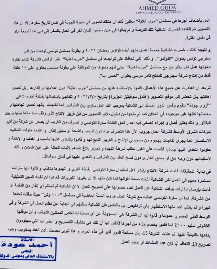 كان المستشار هيثم عباس، وكيل شركة العدل جروب أقام دعوى تعويض حملت رقم ٢٨٥ لسنة ١٣ استئناف اقتصادي أمام المحكمة الاقتصادية، لإخلالها بالتعاقد وعدم التزامها بتنفيذ بنود عقدها بالعمل بمسلسل (حرب أهلية) لعدم حصولها على تصريح بالعمل وفق قانون العمل المصري ونقابة المهن التمثيلية.