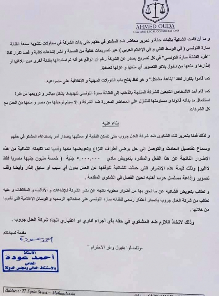بعد مطالبتها بتعويض 10 ملايين جنيه.. سارة التونسي ترد على اتهامات العدل جروب