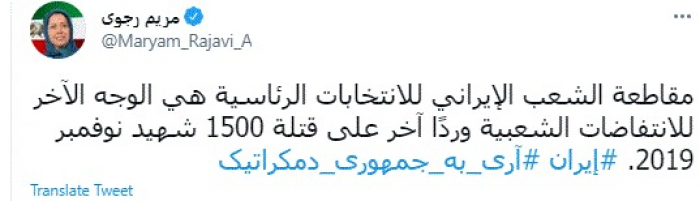 وقالت في تغريدة عبر "تويتر" رصدها "المشهد العربي": "مقاطعة الشعب الإيراني للانتخابات الرئاسية هي الوجه الآخر للانتفاضات الشعبية وردًا آخر على قتلة 1500 شهيد نوفمبر 2019".