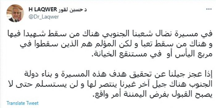 وكتب في تغريدة عبر "تويتر" رصدها "المشهد العربي": "في مسيرة نضال شعبنا الجنوبي هناك من سقط شهيدًا فيها وهناك من سقط تعبًا ولكن المؤلم هم الذين سقطوا في مربع اليأس أو في مستنقع الخيانة".