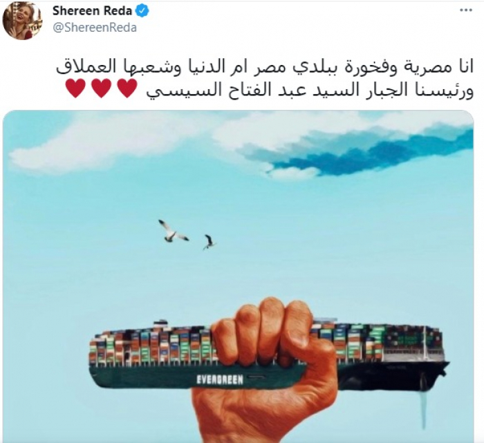 وكتبت شيرين تغريدة، عبر حسابها الرسمي بموقع "تويتر"، :" أنا مصرية وفخورة ببلدي مصر أم الدنيا وشعبها العملاق ورئيسنا الجبار السيد عبد الفتاح السيسي".