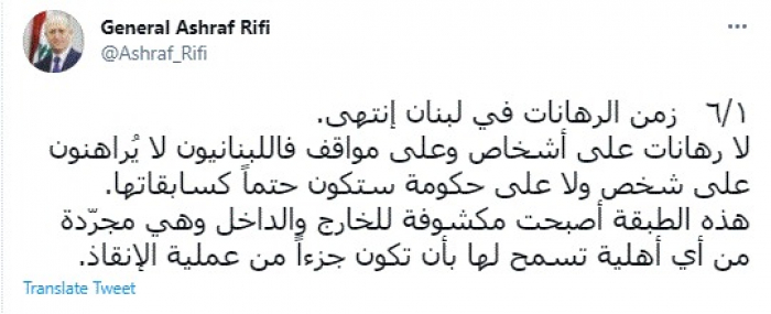 وقال في تغريدة عبر "تويتر" رصدها "المشهد العربي": "زمن الرهانات في لبنان إنتهى. لا رهانات على أشخاص وعلى مواقف فاللبنانيون لا يُراهنون على شخص ولا على حكومة ستكون حتماً كسابقاتها".