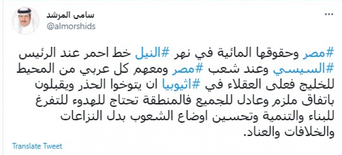 وقال في تغريدة عبر "تويتر" رصدها "المشهد العربي": "مصر وحقوقها المائية في نهر النيل خط أحمر عند الرئيس السيسي وعند شعب مصر ومعهم كل عربي من المحيط للخليج فعلى العقلاء في إثيوبيا أن يتوخوا الحذر ويقبلون باتفاق ملزم وعادل للجميع فالمنطقة تحتاج للهدوء للتفرغ للبناء والتنمية وتحسين اوضاع الشعوب بدل النزاعات والخلافات والعناد".