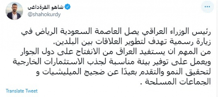 دعا الكاتب الصحفي العراقي شاهو القرةداغي، اليوم، رئيس الوزراء العراقي مصطفى الكاظمي لاستغلال زيارته للسعودية بهدف الانفتاح على دول الجوار.