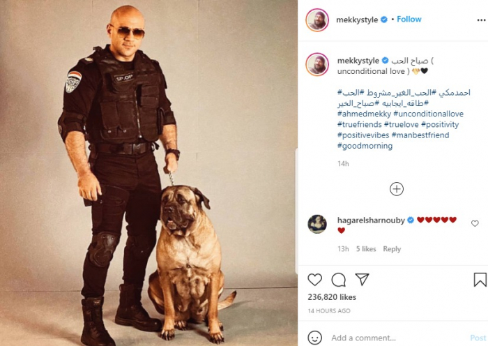 وظهر "مكي" في الصورة مرتديًا بدلة "ضابط" بجوار "كلب" حراسة، وعلق :"صباح الحب".