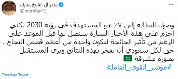 أشاد المدون السعودي البارز منذر آل الشيخ مبارك، اليوم، بسياسة السعودية الناجحة في محاربة البطالة.