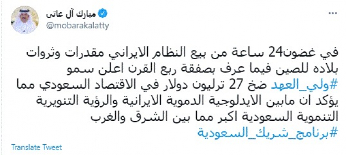 وقال في تغريدة عبر "تويتر" رصدها "المشهد العربي": "في غضون 24 ساعة من بيع النظام الإيراني مقدرات وثروات بلاده للصين فيما عرف بصفقة ربع القرن أعلن سمو ولي العهد ضخ 27 ترليون دولار في الاقتصاد السعودي مما يؤكد أن مابين الأيدلوجية الدموية الايرانية والرؤية التنويرية التنموية السعودية أكبر مما بين الشرق والغرب".