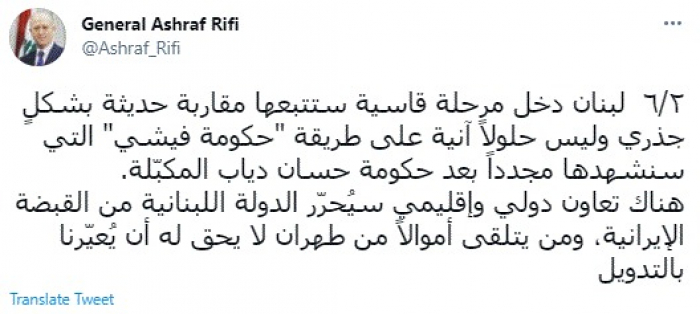 توقع الوزير اللبناني السابق الجنرال أشرف ريفي، اليوم، تحرير لبنان من القبضة الإيرانية، مؤكدًا أن الأزمة اللبنانية تحتاج إلى حلول جذرية.
