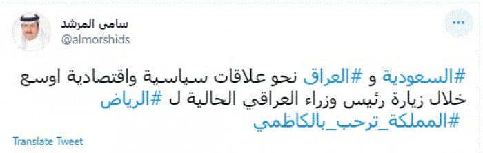 وكتب في تغريدة عبر "تويتر" رصدها "المشهد العربي": "السعودية والعراق نحو علاقات سياسية واقتصادية أوسع خلال زيارة رئيس وزراء العراقي الحالية للرياض".