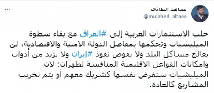 ورأى في تغريدة على حسابه بموقع التدوين المصغر تويتر، اليوم أن: "جلب الاستثمارات العربية إلى العراق مع بقاء سطوة المليشيات وتحكمها بمفاصل الدولة الأمنية والاقتصادية، لن يعالج مشاكل البلد ولا يقوض نفوذ إيران ولا يزيد من أدوات وإمكانات الفواعل الاقليمية المنافسة لطهران".