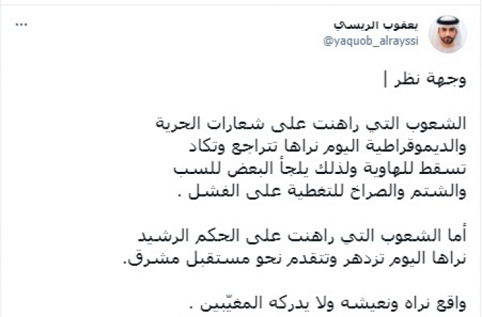 وقال في تغريدة على حسابه بموقع التدوين المصغر تويتر، اليوم إنه: "وجهة نظر| الشعوب التي راهنت على شعارات الحرية والديموقراطية اليوم نراها تتراجع وتكاد تسقط للهاوية ولذلك يلجأ البعض للسب والشتم والصراخ للتغطية على الفشل".