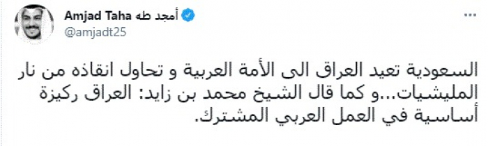 وكتب في تغريدة عبر "تويتر" رصدها "المشهد العربي": "السعودية تعيد العراق إلى الأمة العربية وتحاول إنقاذه من نار المليشيات... وكما قال الشيخ محمد بن زايد: العراق ركيزة أساسية في العمل العربي المشترك".