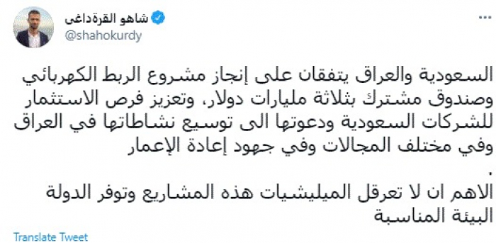 وقال في تغريدة عبر "تويتر" رصدها "المشهد العربي": "السعودية والعراق يتفقان على إنجاز مشروع الربط الكهربائي وصندوق مشترك بثلاثة مليارات دولار، وتعزيز فرص الاستثمار للشركات السعودية ودعوتها الى توسيع نشاطاتها في العراق وفي مختلف المجالات وفي جهود إعادة الإعمار.. الأهم أن لا تعرقل المليشيات هذه المشاريع وتوفر الدولة البيئة المناسبة".