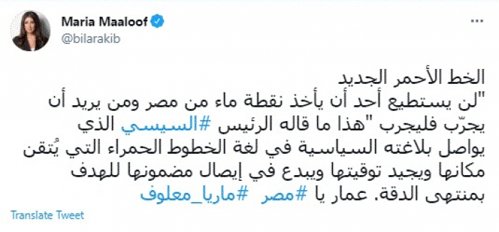 وقالت في تغريدة عبر "تويتر" رصدها "المشهد العربي": "الخط الأحمر الجديد.. لن يستطيع أحد أن يأخذ نقطة ماء من مصر ومن يريد أن يجرّب فليجرب هذا ما قاله الرئيس السيسي الذي يواصل بلاغته السياسية في لغة الخطوط الحمراء التي يُتقن مكانها ويجيد توقيتها ويبدع في إيصال مضمونها للهدف بمنتهى الدقة. عمار يا مصر".