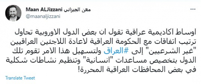 وقال في تغريدة عبر "تويتر" رصدها "المشهد العربي": "أوساط أكاديمية عراقية تقول أن بعض الدول الأوروبية تحاول ترتيب اتفاقات مع الحكومة العراقية لإعادة اللاجئين العراقيين غير الشرعيين إلى العراق ولتسهيل هذا الأمر تقوم تلك الدول بتخصيص مساعدات إنسانية وتنظيم نشاطات شكلية في بعض المحافظات العراقية المحررة".