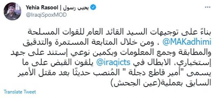 وقال في تغريدة عبر "تويتر" رصدها "المشهد العربي": " بناءً على توجيهات السيد القائد العام للقوات المسلحة، ومن خلال المتابعة المستمرة والتدقيق والمطابقة وجمع المعلومات وبكمين نوعي إستند على جهد إستخباري، الأبطال يلقون القبض على ما يسمى أمير قاطع دجلة المُنصب حديثًا بعد مقتل الأمير السابق بعملية (عين الجحش)".