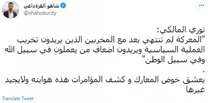 وقال في تغريدة عبر "تويتر" رصدها "المشهد العربي": "نوري المالكي: المعركة لم تنتهي بعد مع المخربين الذين يريدون تخريب العملية السياسية ويريدون اضعاف من يعملون في سبيل الله وفي سبيل الوطن. يعشق خوض المعارك وكشف المؤامرات هذه هوايته ولا يجيد غيرها".