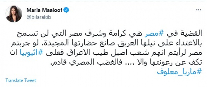 وكتبت في تغريدة عبر "تويتر" رصدها "المشهد العربي": "القضية في مصر هي كرامة وشرف مصر التي لن تسمح بالاعتداء على نيلها العريق صانع حضارتها المجيدة. لو جربتم مصر لرأيتم إنهم شعب أصيل طيب الأعراق فعلى إثيوبيا أن تكف عن رعونتها وإلا .... فالغضب المصري قادم".