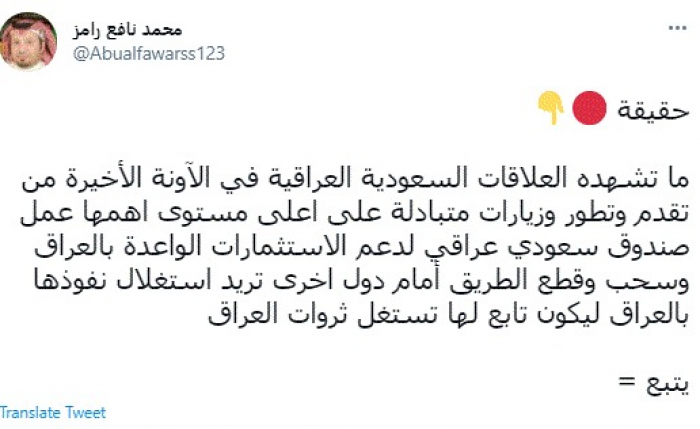 وكتب في تغريدة عبر "تويتر" رصدها "المشهد العربي": "حقيقة.. ما تشهده العلاقات السعودية العراقية في الآونة الأخيرة من تقدم وتطور وزيارات متبادلة على اعلى مستوى اهمها عمل صندوق سعودي عراقي لدعم الاستثمارات الواعدة بالعراق وسحب وقطع الطريق أمام دول أخرى تريد استغلال نفوذها بالعراق ليكون تابع لها تستغل ثروات العراق".
