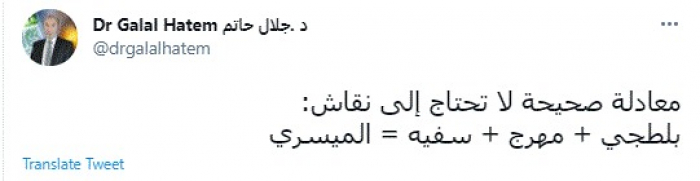 وقال في تغريدة عبر "تويتر" رصدها "المشهد العربي": "معادلة صحيحة لا تحتاج إلى نقاش: بلطجي + مُهرج + .... = الميسري".