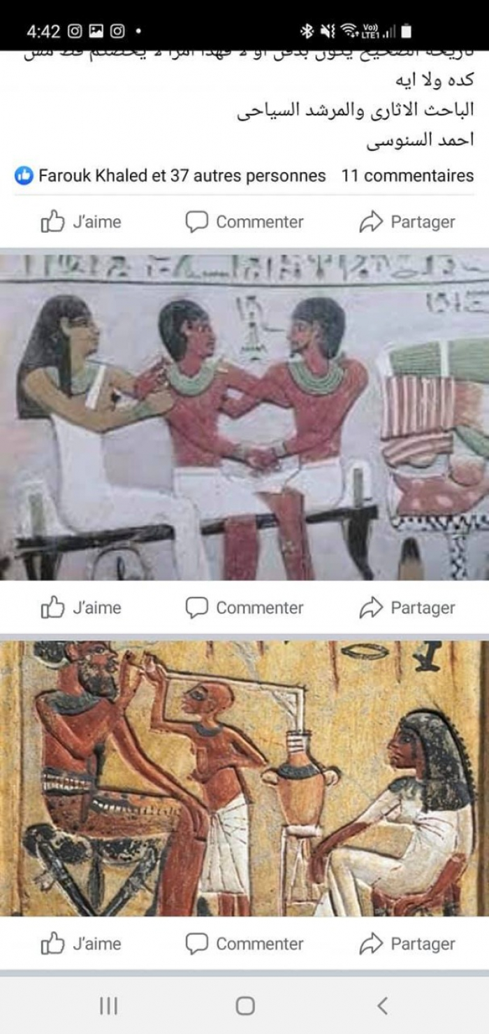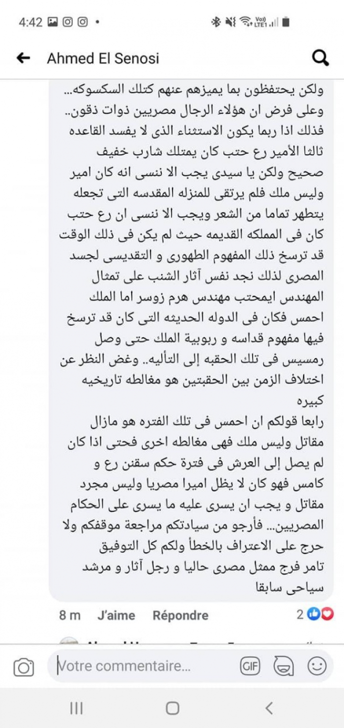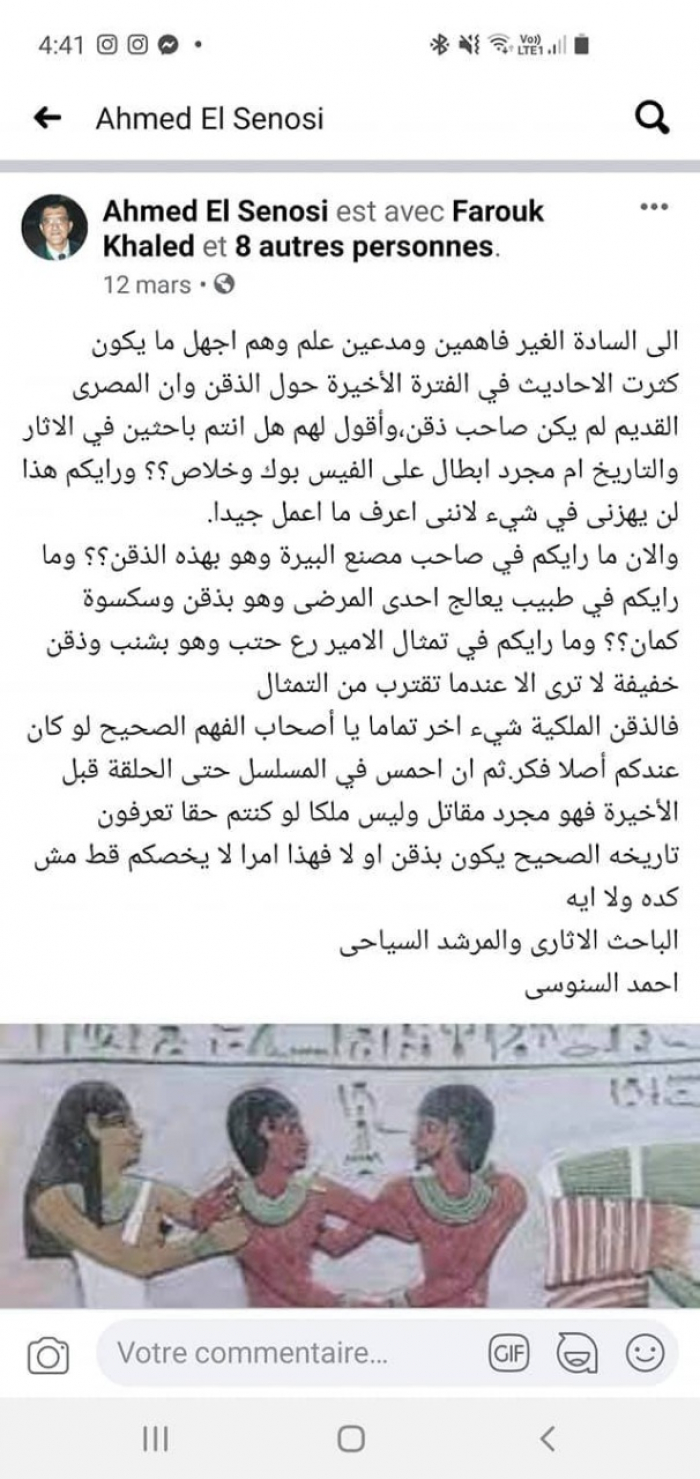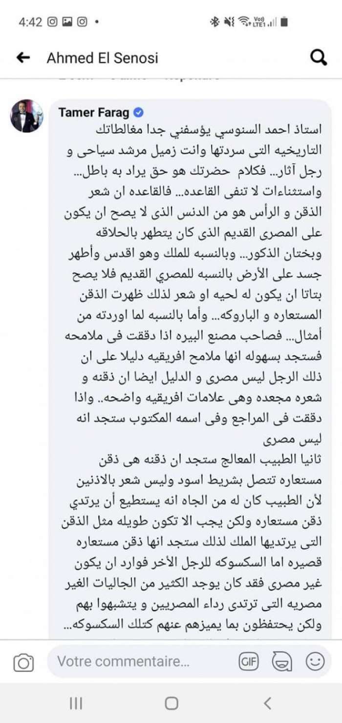 ليرد تامر فرج على منشور "السنوسي"، قائلًا: " أستاذ أحمد السنوسي يؤسفني جدا مغالطاتك التاريخية التي سردتها وأنت زميل مرشد سياحى ورجل آثار، فكلام حضرتك هو حق يراد به باطل، واستثناءات لا تنفي القاعدة... فالقاعدة أن شعر الذقن والرأس هو من الدنس الذي لا يصح أن يكون على المصرى القديم الذى كان يتطهر بالحلاقة وبختان الذكور، وبالنسبة للملك وهو أقدس وأطهر جسد على الأرض بالنسبة للمصري القديم فلا يصح بتاتا أن يكون له لحية أو شعر لذلك ظهرت الذقن المستعارة والباروكة، وأما بالنسبة لما أوردته من أمثال، فصاحب مصنع البيرة إذا دققت في ملامحه فستجد بسهولة أنها ملامح أفريقية دليلا على أن ذلك الرجل ليس مصرى والدليل أيضا أن ذقنه و شعره مجعدة وهى علامات إفريقية واضحة.. وإذا دققت فى المراجع وفى اسمه المكتوب ستجد أنه ليس مصري".