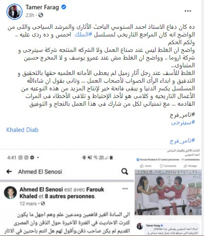 وعاد وعلق تامر فرج على النقاش بينه وبين السنوسي قائلا: "ده كان دفاع الأستاذ أحمد السنوسي الباحث الآثاري والمرشد السياحي واللي من الواضح أنه كان المراجع التاريخي لمسلسل الملك أحمس وده ردى عليه.. ولكم الحكم".