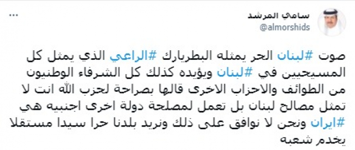 أكد المحلل السياسي السعودي سامي المرشد أن البطريرك الراعي في لبنان يمثل كل الشرفاء في مواجهة ممارسات مليشيات حزب الله الموالية لإيران التي لا تمثل مصالح لبنان.