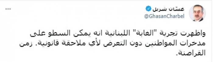 وقال في تغريدة على حسابه بموقع التدوين المصغر تويتر، اليوم إنه: "أظهرت تجربة (الغابة) اللبنانية أنه يمكن السطو على مدخرات المواطنين دون التعرض لأي ملاحقة قانونية"، مضيفا أنه: "زمن القراصنة".