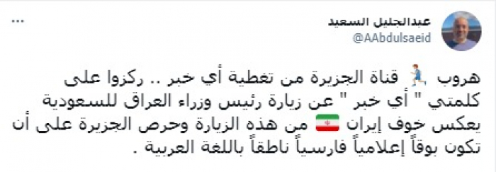ونبه في تغريدة على حسابه بموقع التدوين المصغر تويتر، اليوم إلى أن: "هروب قناة الجزيرة من تغطية أي خبر، ركزوا على كلمتي (أي خبر) عن زيارة رئيس وزراء العراق للسعودية يعكس خوف إيران من هذه الزيارة".