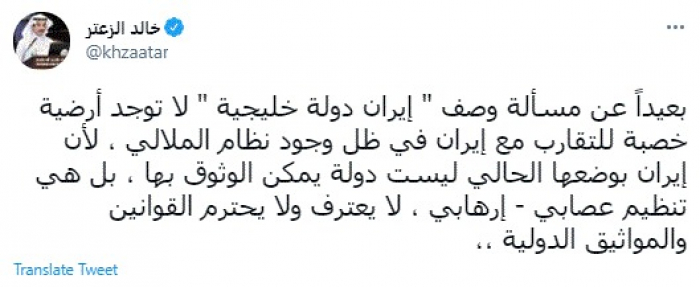 وكتب في تغريدة عبر "تويتر" رصدها "المشهد العربي": "بعيداً عن مسألة وصف إيران دولة خليجية لا توجد أرضية خصبة للتقارب مع إيران في ظل وجود نظام الملالي، لأن إيران بوضعها الحالي ليست دولة يمكن الوثوق بها ، بل هي تنظيم عصابي - إرهابي ، لا يعترف ولا يحترم القوانين والمواثيق الدولية".