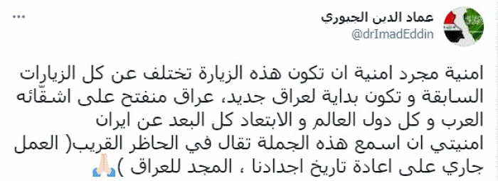 وقال في تغريدة عبر "تويتر" رصدها "المشهد العربي": "أمنية مجرد أمنية أن تكون هذه الزيارة تختلف عن كل الزيارات السابقة وتكون بداية لعراق جديد، عراق منفتح على أشقّائه العرب وكل دول العالم والابتعاد كل البعد عن إيران أمنيتي أن أسمع هذه الجملة تقال في الحاظر القريب (العمل جاري على إعادة تاريخ أجدادنا، المجد للعراق)".