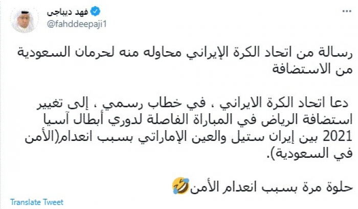 وقال في تغريدة عبر "تويتر" رصدها "المشهد العربي": "رسالة من اتحاد الكرة الإيراني محاوله منه لحرمان السعودية من الاستضافة.. دعا اتحاد الكرة الايراني ، في خطاب رسمي ، إلى تغيير استضافة الرياض في المباراة الفاصلة لدوري أبطال آسيا 2021 بين إيران ستيل والعين الإماراتي بسبب انعدام (الأمن في السعودية).. حلوة مرة بسبب انعدام الأمن".