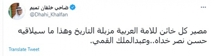وأضاف في تغريدة أخرى: "مصير كل خائن للأمة العربية مزبلة التاريخ وهذا ما سيلاقيه حسن نصر خداه.. وعبدالملك القمي".