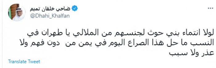 وقال في تغريدة عبر "تويتر" رصدها "المشهد العربي": "لولا انتماء بني حوث لجنسهم من الملالي - طهران في النسب ما حل هذا الصراع اليوم في يمن من دون فهم ولا عذر ولا سبب".