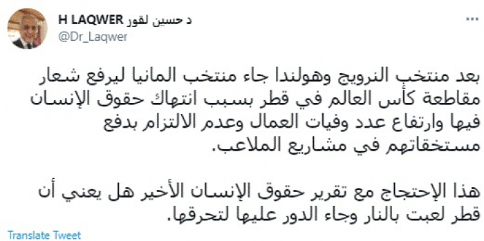 وقال في تغريدة عبر "تويتر" رصدها "المشهد العربي": "بعد منتخب النرويج وهولندا جاء منتخب المانيا ليرفع شعار مقاطعة كأس العالم في قطر بسبب انتهاك حقوق الإنسان فيها وارتفاع عدد وفيات العمال وعدم الالتزام بدفع مستخقاتهم في مشاريع الملاعب".