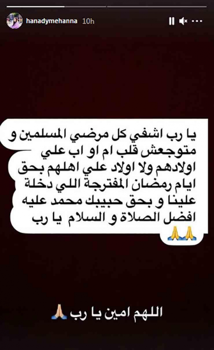 وكتبت هنادي، عبر خاصية "ستوري" على حسابها بموقع "إنستجرام": "يارب اشفي كل مرضى المسلمين ومتوجعش قلب أم أو أب على أولادهم ولا أولاد على أهلهم بحق أيام رمضان المفترجة اللي داخلة علينا، وبحق حبيبك محمد عليه أفضل الصلاة والسلام يارب، اللهم أمين يارب".